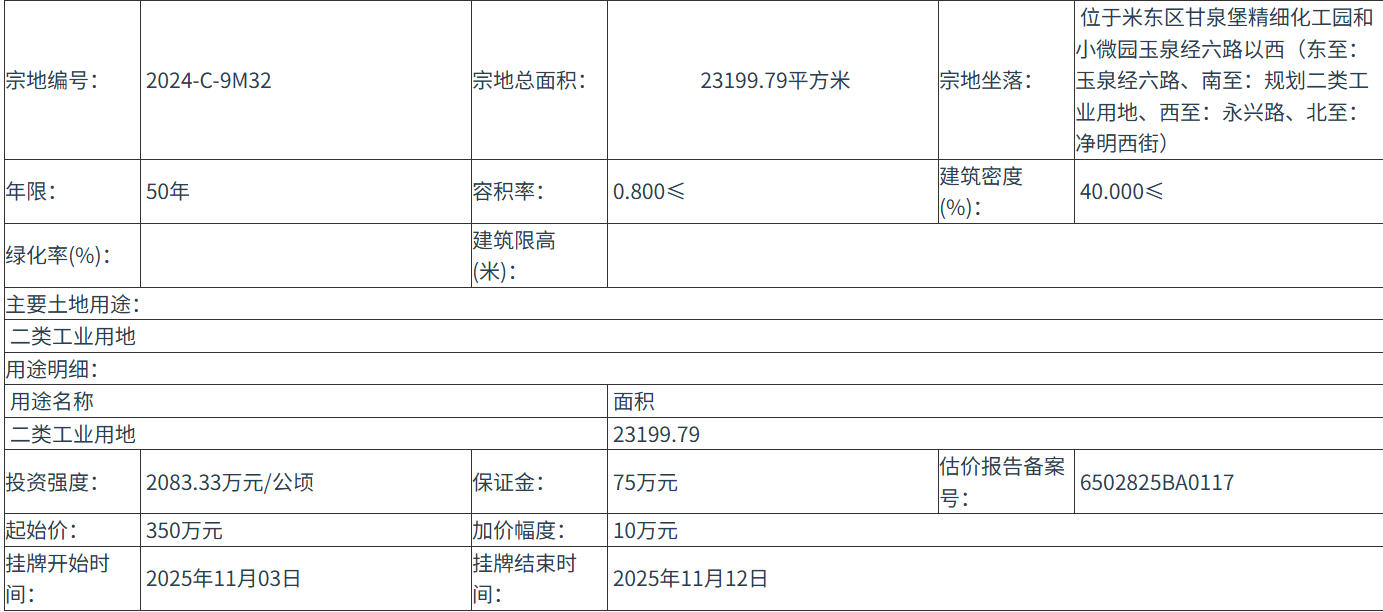 五、 申请人可于 2025年10月20日 至 2025年11月10日 到 乌鲁木齐市自然资源交易市场 向我局提交书面申请。交纳竞买保证金的截止时间为2025年11月10日 16时00分 。经审核,申请人按规定交纳竞买保证金,具备申请条件的,我局将在 2025年11月10日 16时00分 前确认其竞买资格。