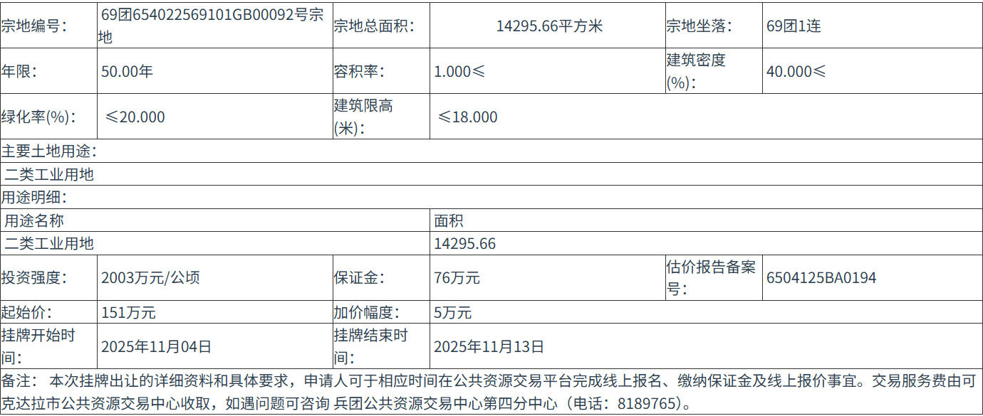 69团654022569101GB00092号宗地 号地块:2025年11月04日 10时00分 至 2025年11月13日 18时00分;